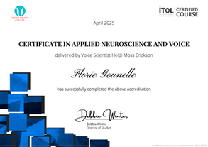 I'm passionate about continuing education, and I regularly train with internationally recognized experts in voice, pedagogy, coaching, and vocal health. Here are a few highlights: